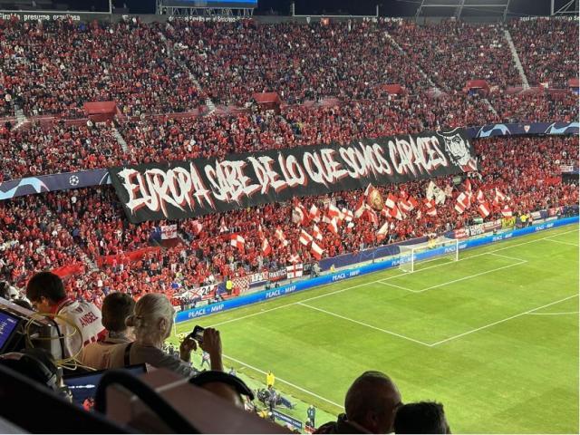 本场塞维球迷继续制造魔鬼般的氛围,赛前集体高唱战歌的声势,甚至压过了现场播放的欧冠主题曲。开场后每当阿森纳球员拿球,现场震耳欲聋的嘘声足以给对手极大的压迫感。在主场球迷声势加持之下,塞维利亚凶狠的中场绞杀和边路压迫让枪手难以打出高质量的进攻,上半场枪手门将拉亚把守的球门恰好处在塞维利亚死忠看台“比里斯”正下方,结果层层叠叠的压迫感导致拉亚数次出球失误。拉莫斯、拉基蒂奇和阿库尼亚组成的塞维利亚左路防区,也限制住了厄德高和萨卡这一路的发挥。